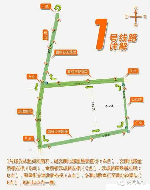 1號線為從起點(diǎn)向南開,經(jīng)文淵北路圍墾街直行(A點(diǎn)),文淵北路金喬街左拐(B點(diǎn)),金喬街元成路左拐(C點(diǎn)),元成路圍墾街左拐(D點(diǎn)),圍墾街文淵北路右拐(A點(diǎn)),文淵北路直行至最北邊調(diào)頭(E點(diǎn)),返回起點(diǎn)為一圈。