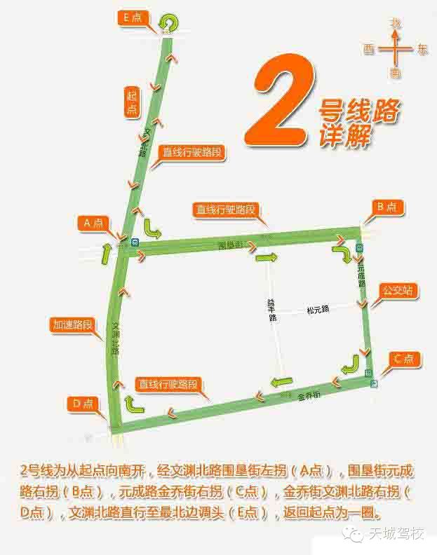 2號線為從起點(diǎn)向南開,經(jīng)文淵北路圍墾街左拐(A點(diǎn)),圍墾街元成路右拐(B點(diǎn)),元成路金喬街右拐(C點(diǎn)),金喬街文淵北路右拐(D點(diǎn)),文淵北路直行至最北邊調(diào)頭(E點(diǎn)),返回起點(diǎn)為一圈。