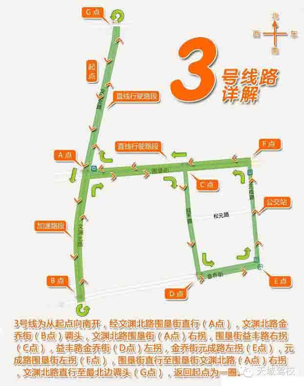 3號線為從起點(diǎn)向南開,經(jīng)文淵北路圍墾街直行(A點(diǎn)),文淵北路金喬街調(diào)頭(B點(diǎn)),文淵北路圍墾街右拐(A點(diǎn)),圍墾街益豐路右拐(C點(diǎn)),益豐路金喬街左拐(D點(diǎn)),金喬街元成路左拐(E點(diǎn)),元成路圍墾街左拐(F點(diǎn)),圍墾街直行至圍墾街文淵北路右拐(A點(diǎn)),文淵北路直行至最北邊調(diào)頭(E點(diǎn)),返回起點(diǎn)為一圈。